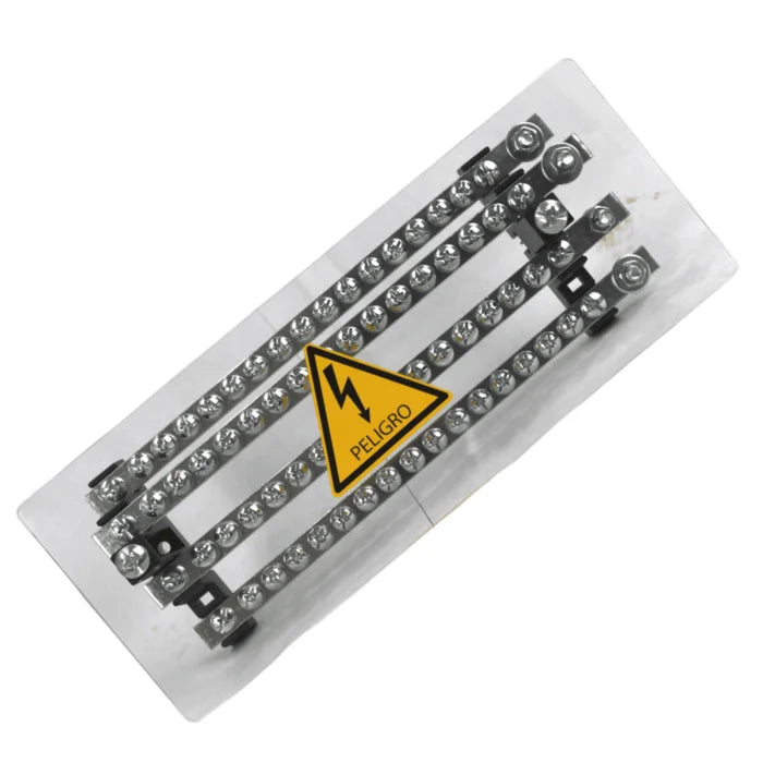 Barras repartidoras bipolares compuestas por soportes tipo escalera aislantes, con barra de bronce perforadas para conexiones y derivación de líneas de fases, tierra y neutro dentro de un tablero eléctrico, cuenta con cubierta transparente para protección.