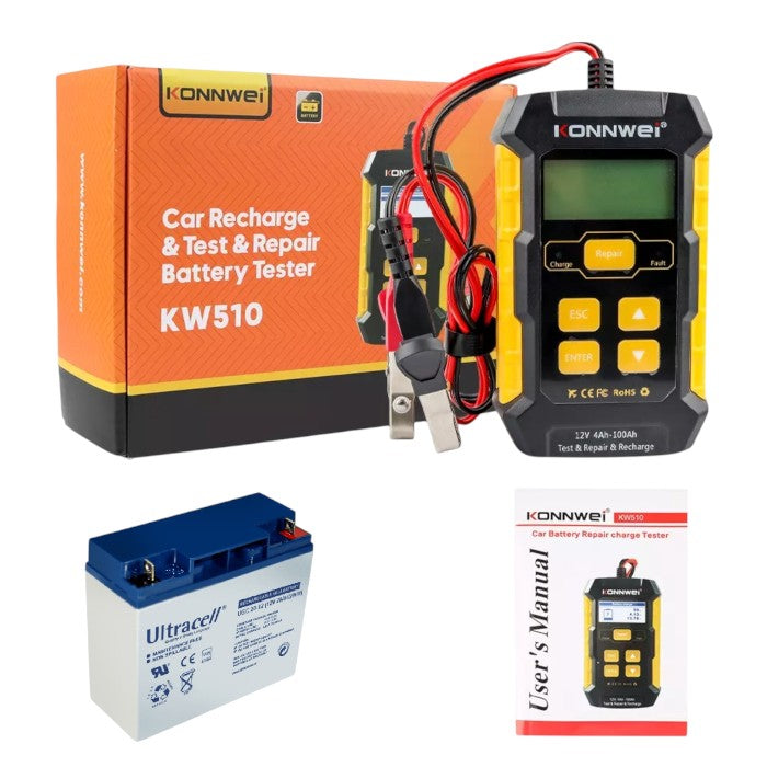 Este combo incluye el cargador y analizador de baterías KONNWEI KW510, ideal para automóviles, motos y sistemas de respaldo, junto a una batería ULTRACELL de 12V, reconocida por su rendimiento y confiabilidad.