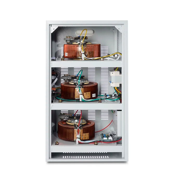El estabilizador de voltaje Serie EVTRI trifásico se compone de tres grupos de estabilizadores de voltaje monofásico SVC con conexión en "estrella". Tiene la función